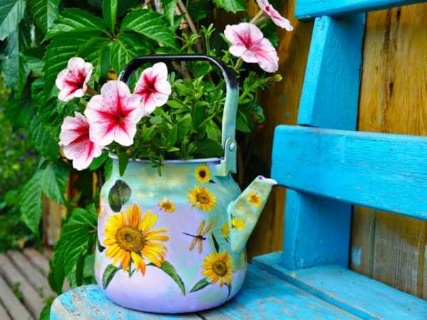 Старый металлический чайник — отличная клумба для цветов