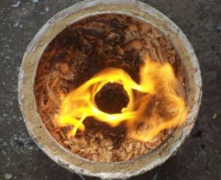 Для этого разжигают огонь с помощью ветоши, смоченной в бензине или керосине. Топливо, нагреваясь, расщепляется на более простые легковоспламеняющиеся вещества. Дальше процесс пиролизного горения поддерживает сам себя.