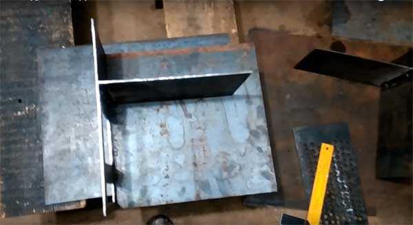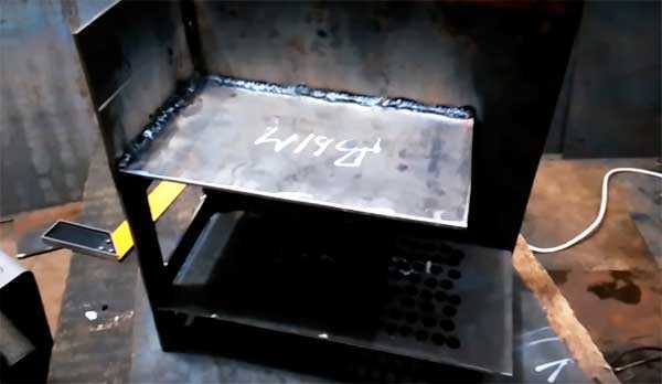 - Разметив место установки колосника, приварите к боковинам уголки для его укладки. Теперь, с помощью электросварки соберите коробку конструкции, обязательно проверьте диагональ и правильное соединение всех деталей. Обварите коробок в 1 проход, отбейте шлак, убедитесь в отсутствии пор и дырок.
