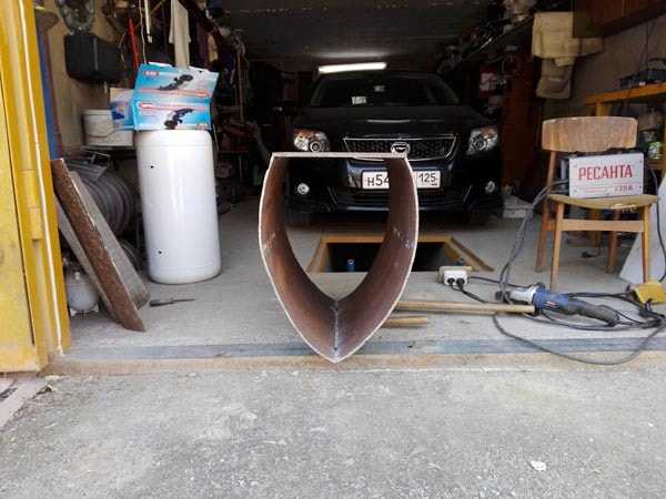 Четвертый шаг. Подключите дымоход. Для этого при помощи болгарки срежьте вентиль баллона и приварите вместо него длинную металлическую трубу диаметром порядка 9-10 см. Саму дымоотводящую трубу следует вывести из гаража через стену либо крышу. Подключать дымоход к общей вытяжке не рекомендуется, т.к. в данном случае тяга может быть недостаточной, и угарный газ начнет заполнять помещение.