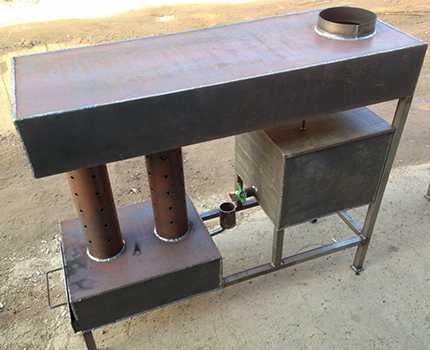 Конструкция цилиндрического двухобъемного котла на отработке обеспечивает высокую температуру и полное сгорание топлива. Вместо цилиндрических можно использовать прямоугольные камеры.