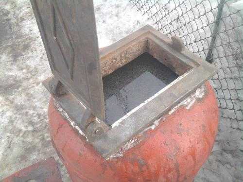Чтобы из газового баллона получилась печь, в корпусе необходимо вырезать отверстия для дверки и под дымоход. Вырезанные участки металла послужат дверцами, после того, как к ним приварят завесы и запирающий механизм. Для поступления воздуха в топку дверку внизу сверлят насквозь.