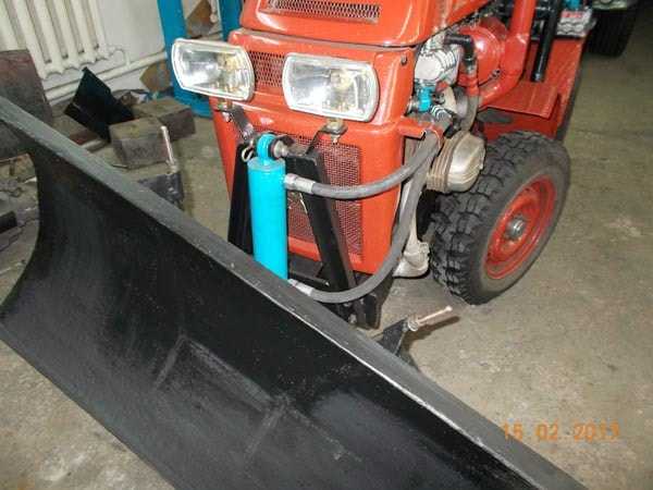 - Подобрать гидроцилиндры для навесного оборудования и для отвала. Подойдут цилиндр от трактора МТЗ и привод рулевого управления от комбайна Нива. При выборе нужно руководствоваться диаметром поршня — чем он больше, тем большее усилие создаст шток цилиндра.