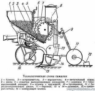 Посадочное устройство состоит из металлической трубки диаметром 10 см, к которой крепится сошник для прорезывания борозды. Высота его, а значит и глубина борозды, регулируется вертикальным перемещением конструкции.
