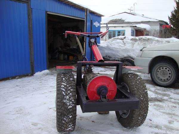 По такому же принципу мастера изготавливают снегоходы-самоделки из мотоблока, предназначеные для передвижения зимой. Камеры низкого давления позволяют ездить даже по глубокому рыхлому снегу. Простая конструкция снегохода предполагает использование одноосного мотоблока с увеличенным расстоянием между колесами и широкой лыжи сзади с сидением для водителя.
