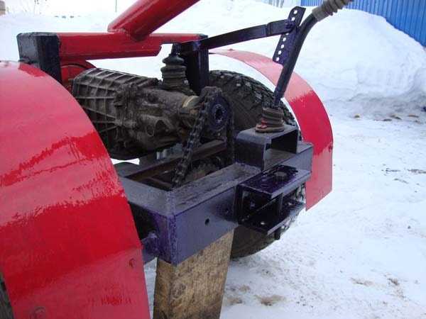 Коробка передач, сцепление и редуктор (в отдельных моделях еще и дифференциал) обеспечивают преобразование крутящего момента вала двигателя во вращение пары колес. Они могут быть на пневматическом ходу или утяжеленные металлические с дополнительными грунтозацепами для работы под нагрузкой.