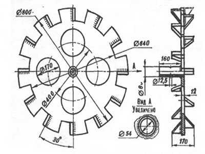 Важная особенность мотоблока Архипова – необычные ходовые колеса, круглые и плоские, напоминающие диски циркулярной пилы. Только вместо зубьев у них грунтозацепы. Такие колеса хорошо сцепляются с почвой, при проходе не уплотняют ее. Наоборот, при вращении грунтозацепов происходит дополнительное рыхление грядок. Колеса вырезаются из листовой стали S =10-12 мм с помощью бензореза. Грунтозацепы выполняют в соответствии с чертежами. Вместо таких колес для мотоблока подойдут и обычные автомобильные шины, но они будут иметь меньшее сцепление с почвой и поэтому пробуксовывать при работе мотоблока.