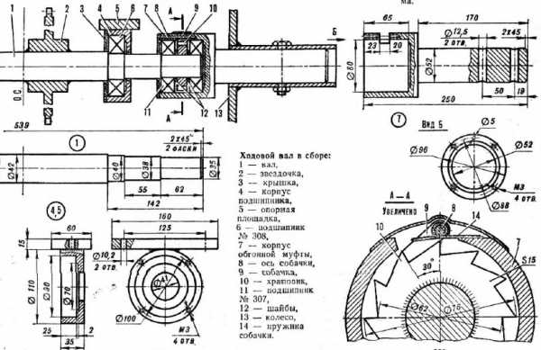 Основные элементы ходового вала: 1 — вал, 2 — звездочка, 3 — крышка, 4 — корпус подшипника, 5 — опорная площадка, 6 — подшипник № 308, 7 — корпус обгонной муфты, 8 — ось собачки, 9 — собачка,10 — храповик, 11 — подшипник № 307, 12 — шайбы, 13 — колесо, 14 — пружина собачки