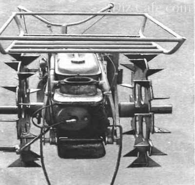 Устройство мотоблока представляет собой самоходную машину на двух колесах, оборудованную движком, снятым с мотороллера ВП-150М. Причиной выбора именно этого двигателя послужило то, что он имеет такое конструктивное решение, благодаря которому осуществляется принудительное охлаждение головки цилиндра воздухом.