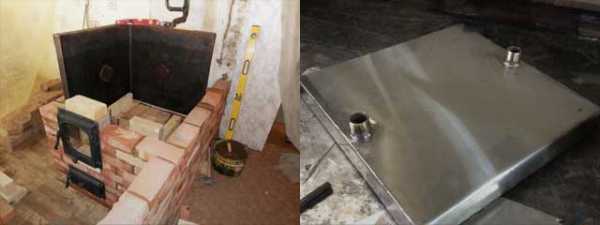 - Сверху камерных стенок прокладывается чугунная варочная плита либо толстый металлический лист, обложенный слоем из кирпича, если не планируется использовать котел для приготовления пищи.