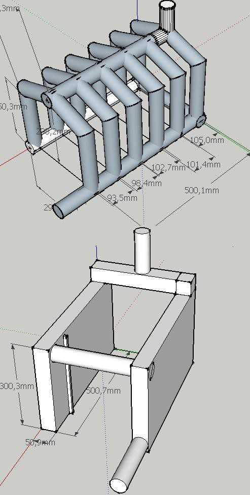 Основой конструкции предлагаемого твердотопливного котла является прямоугольный теплообменник (регистр) из труб прямоугольного профиля 60х40 мм и круглых, диаметром 40 и 50 мм с толщиной стенки 3-5 мм. Трубы прямоугольного профиля используются для облегчения стыка труб, так как круглые трубы стыковать намного сложнее.