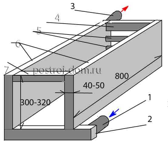 Рис.2 Теплообменник из листовой стали и труб (вариант 2): 1 — труба обратки диам. 50 мм; 2 — профильная труба 60х40 мм; 3 — выходящая труба 50 мм; 4 — труба 60х40 мм; 5 — трубы диаметром 32-40 мм; 6 — боковины из листовой стали толщиной 3-5 мм; 7 — перемычка из трубы 60х40 мм.