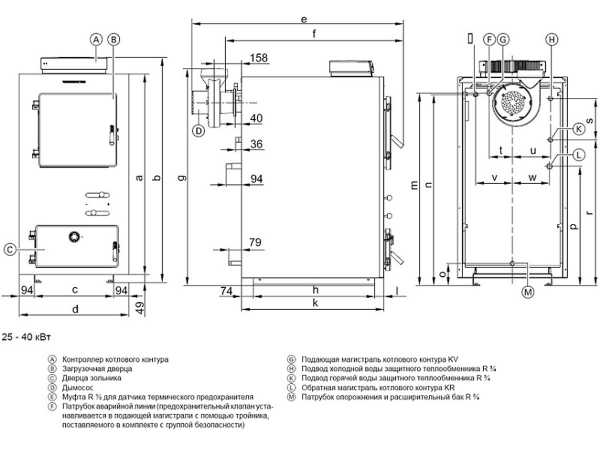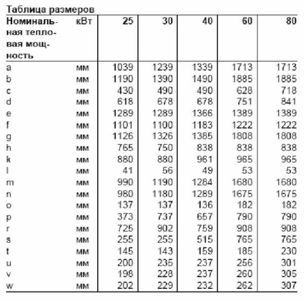 На чертеже представлены размеры котла и обозначения его конструктивных частей. Часть размеров обозначена буквенным кодом — их уточняют по таблице и выбирают по желаемой мощности котла. Эти размеры определены тепловым расчетом, от них зависит правильная и бесперебойная его работа.