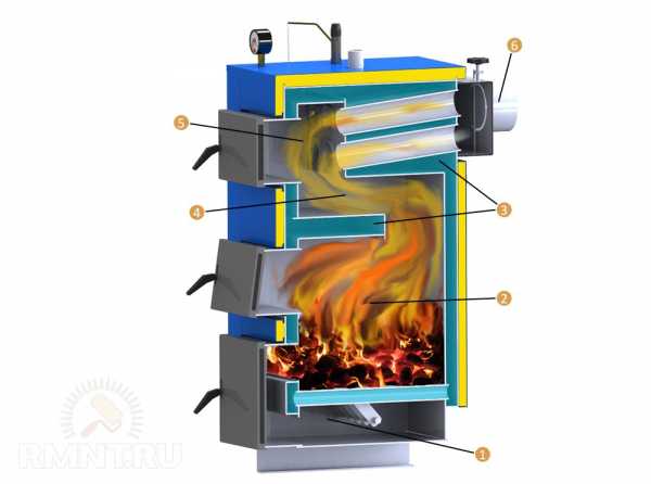 Пиролизный котёл на дровах: 1 — поддувало; 2 — камера загрузки топлива и газификации; 3 — теплобменник; 4 — камера сгорания; 5 — камера дожигания; 6 — дымоход