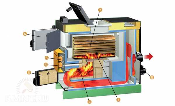 Конструкция пиролизного котла длительного горения: 1 — пиролиз твёрдого топлива; 2 — камера сгорания; 3 — нижняя дверца; 4 — подача вторичного воздуха; 5 — подача первичного воздуха; 6 — верхняя загрузочная дверца; 7 — камера газификации; 8 — дымосос