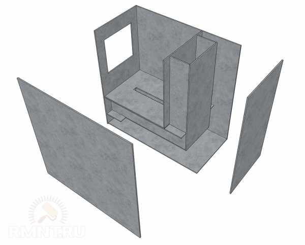 - Разметка деталей первичной и вторичной камеры. Размер вторичной камеры подбираем, чтобы шамотный кирпич укладывался без подрезок. Дно первичной камеры сужается и завершается щелевой форсункой для горения газов.