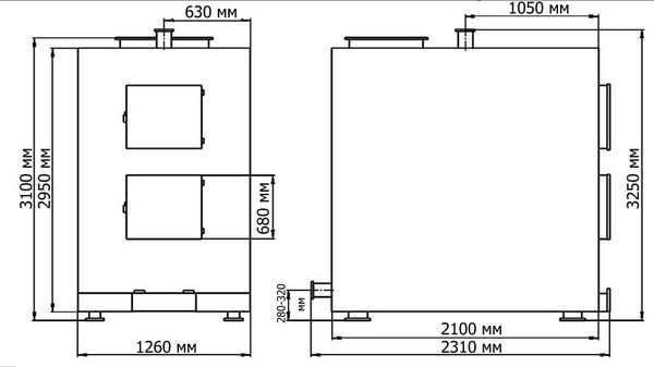 Фото 3. Пример чертежа пиролизного котла длительного горения с указанными размерами. Вид сбоку и спереди.