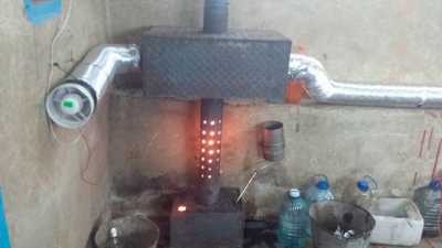 - Монтаж воздуховодов первичного и вторичного воздуха. Следует учесть, что форсунка пиролизных газов сильно нагревается, эта энергия должна эффективно сниматься воздуховодами. Вторичный воздух должен быть горячим, иначе сжигание получится неровным. Сопла воздуха должны быть параллельны движению пиролизных газов.
