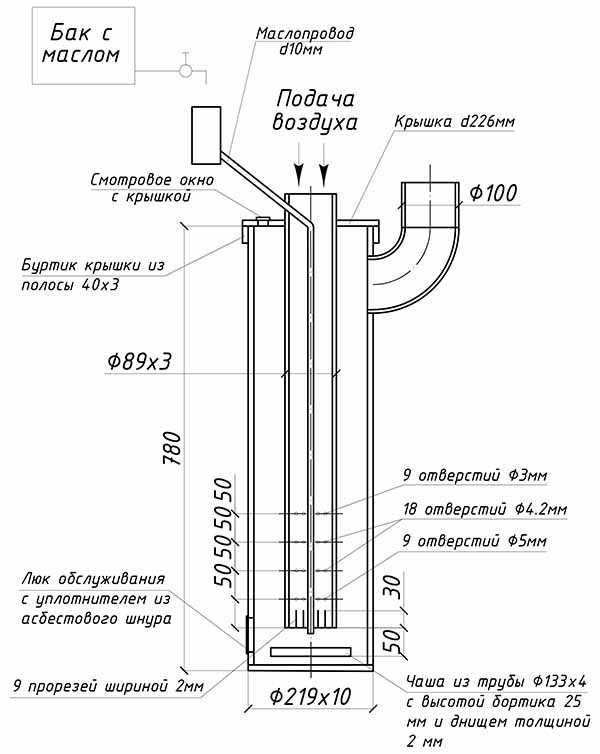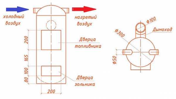 Фото 2. Схема самостоятельной сборки пиролизного котла с дымоходным каналом и верхней загрузочной дверцей.