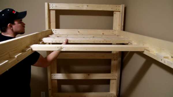 Последним этапом в нашем мастер-калассе — как сделать двухъярусную кровать своими руками — будет укладка реек на дно. У вас уже установлены фиксаторы, которые определяют их местонахождение, они не крепятся саморезами и завершить свое изделие из дерева будет несложно.