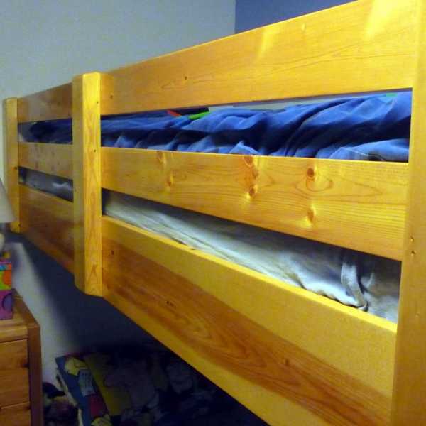 Итак, двухъярусная кровать готова. Она не уступает заводскому образцу по качеству, а обходится дешевле, позволяя сэкономить немалые средства. Сделанный согласно чертежам спальный гарнитур, состоящий из двух уровней, соответствует показателям прочности и прослужит вам не один год. Несмотря на то, что такой предмет мебели имеет довольно большие габариты, он не займет много места, а детская комната не будет казаться перегруженной. Теперь вы знаете, как сделать двухэтажную кровать, не прибегая к помощи сложного профессионального инструмента и услугам столяра.
