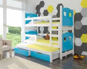 Это также один из популярных вариантов современных кроватей. Данная модель предназначена для трех детей – имеется три спальных места, а еще в конструкции предусмотрены выдвижные ящики, а также полки. Этот двухуровневый «монстр» займет немного больше места, но в нем имеются шкафы и ящички – ребенок будет в них складывать игрушки и свои вещи. Схема двухъярусной кровати такого плана предусматривает, что ящики будут выполнять функцию лестницы – это одновременно и компактно, и эргономично.