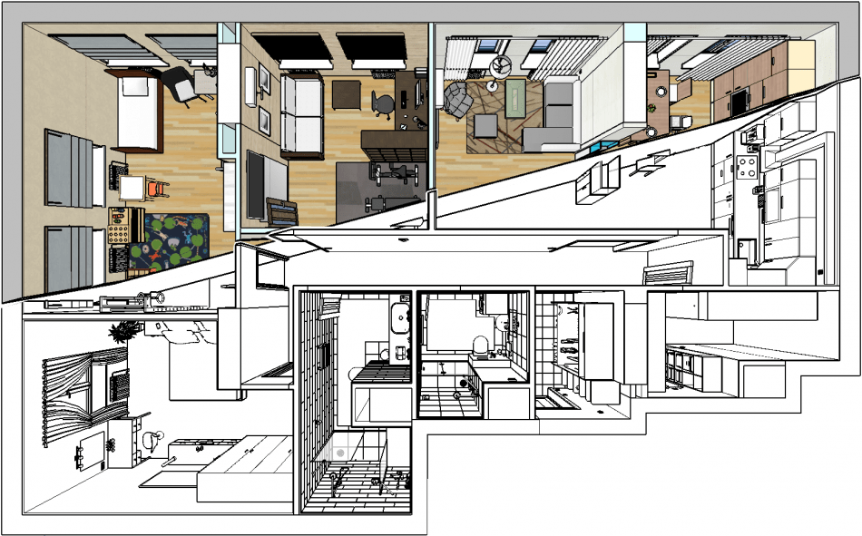 При обдумывании планировки помогает визуализация идей. Делать это можно в дизайнерских программах, онлайн-планировщиках, в альбоме для рисования или на миллиметровой бумаге.