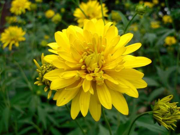 5. Золотые шары или Рудбекия рассеченная. Дачники называют этот цветок многолетней георгиной, хотя правильно отнести его к рудбекии. Сорт Goldball и есть тот цветок, который выращивали наши прабабушки в деревенских палисадниках.