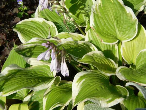 14. Хоста (Hosta). Холодостойкое, теневыносливое растение, не подверженное заболеваниям. Вместе с нежными цветками хоста имеет очень красивую листву. В зависимости от сорта растения она может быть зеленой, голубой, полосатой и даже белой. Листва используется при составлении интересных букетов. Хоста в саду является одним из самых долгоживущих многолетников.