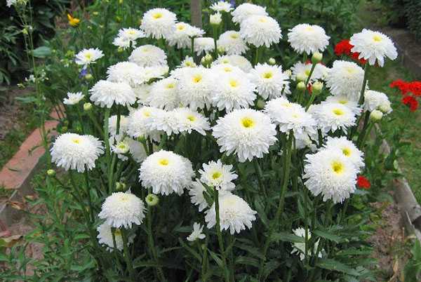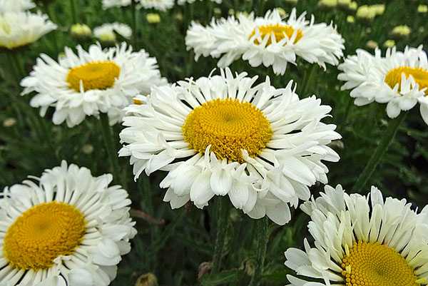 Садовая ромашка, или нивяник способна расти на одном месте 5-10 лет. Сочетание нежно-белых цветочных корзинок и резных зеленых листьев придает любой клумбе привлекательный внешний вид. У нивяника множество разнообразных сортов: среди популярных разновидностей можно выбрать экземпляры с полумахровыми и махровыми соцветиями диаметром от 7 до 17 см. Высота побегов варьируется от 30 см до 1,2 м.