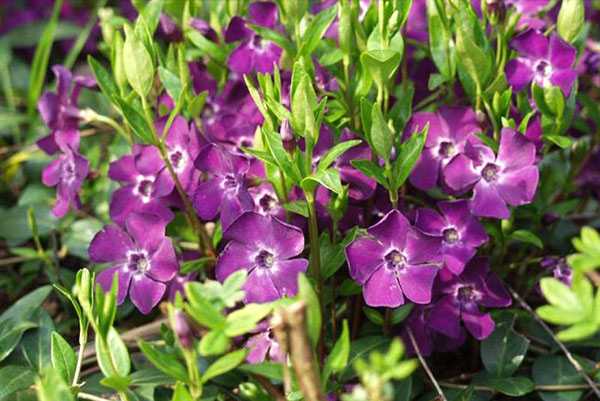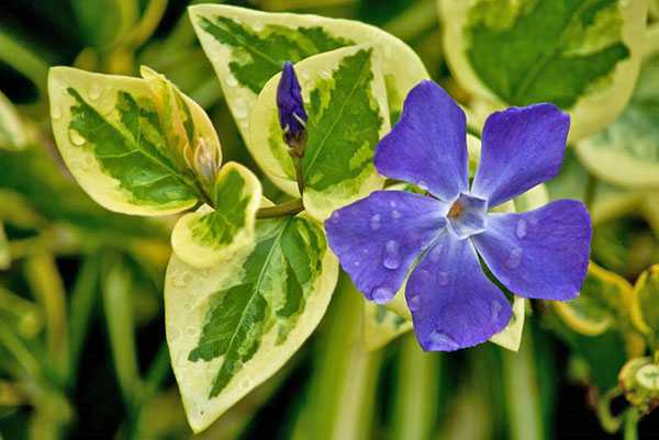 Этот вечнозеленый стелющийся многолетник очень живуч и быстро разрастается вширь. Его плотные кожистые листы без проблем зимуют под снегом, хотя в регионах с суровыми морозами потребуется укрытие. Весной на миниатюрных кустах распускаются голубые или розовые цветки, которые удачно контрастируют с темной зеленью листвы. Лучшими соседями по клумбе для барвинка будут примулы, пролески, гейхеры и гиацинты.