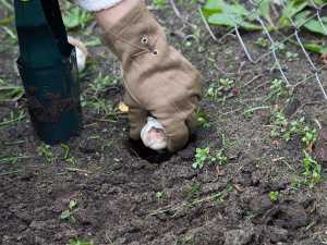 В яму кидают навоз, а сверху землю и уплотняют. Землю насыпают холмиком и поливают. В середину холмика помещают куст. Почки должны находиться на уровне края ямы. Корни засыпают и поливают.