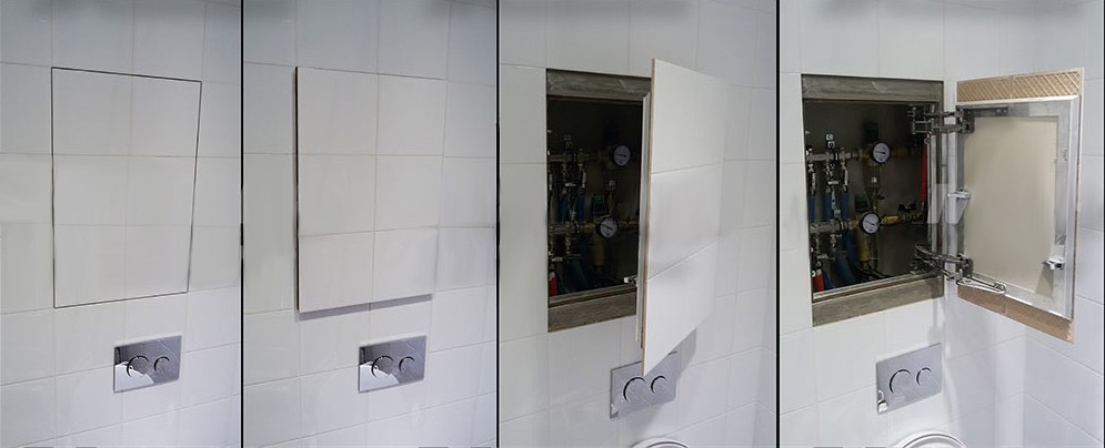 Исходя из этого, планируют размещение ревизионных ниш. Их размеры должны быть достаточны для того, чтобы можно было осмотреть и при необходимости отремонтировать коммуникационный узел. Чтобы закрыть ниши и по возможности замаскировать их, оборудуют люки. Большинство из них имеет конструкцию, которая позволяет отделывать их тем же материалом, что и основная отделка. Это может быть плитка, панели, гипсокартон под покраску, т.п. Такие модели называются скрытым ревизионным люком или люком-невидимкой, поскольку абсолютно незаметны на основании.