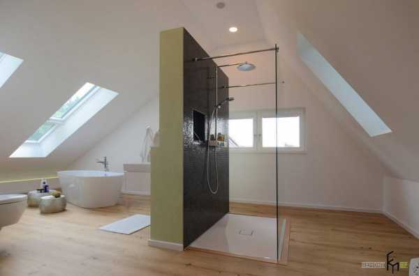 В данном случае, мозаичной плиткой оформлена стена душевой. Контрастный, но природный оттенок плитки, выделяется на фоне белоснежной отделки этой просторной ванной комнаты, расположенной на мансарде.
