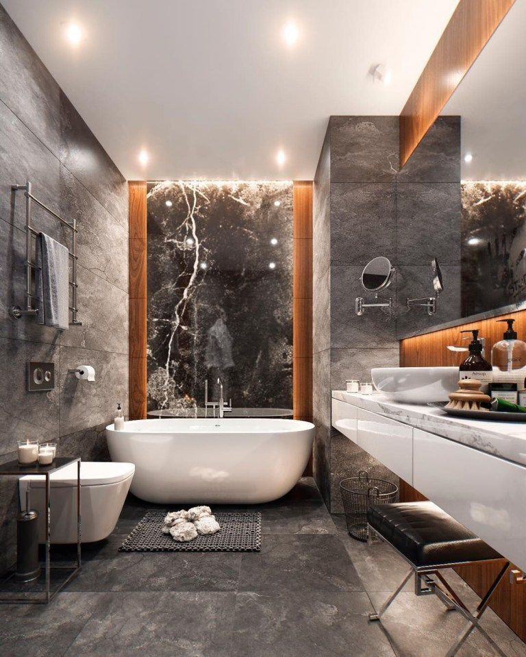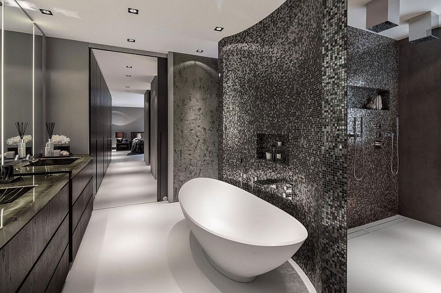 Роскошно гармонирует черная сантехника на фоне темно-серых стен и потолка, плитки под мрамор, с точечными светильниками. Интересно и брутально выглядит акцентная темная кафельная стена с навесной белой мебелью, душем с крупной круглой лейкой.