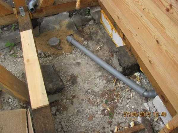 канализационной трубой диаметром 50 мм.Её мы выведем из помещения туалета, предварительно просверлив коронкой отверстие в деревянном полу.
