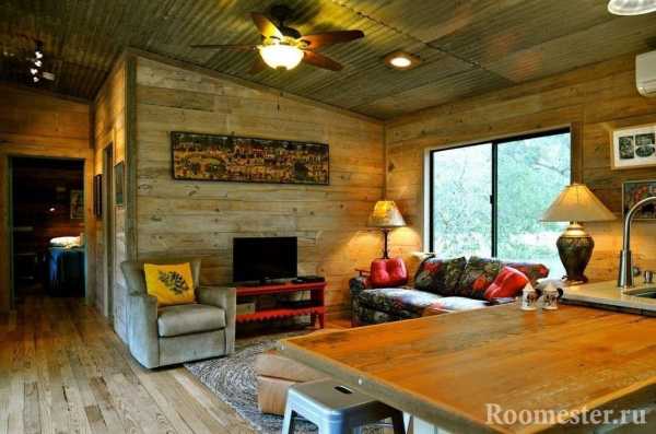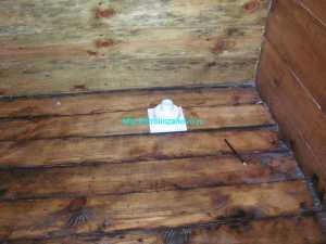 После этого обобьём деревом стены снаружи и потолок внутри. Для окончательной отделки отшлифуем тёс болгаркой с насадкой для наждачной бумаги. В конце обработаем дерево антисептиком и красим всё помещение акватексом цвета сосна.
