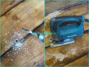 Положили его на пол и карандашом обвели по периметру. Отступив от черты внутрь 1 см, просверлили дрелью 4 отверстия и лобзиком вырезали выемку для трапа.