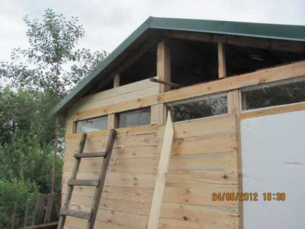 После того, как мы утеплили строение пенопластом, со стороны улицы прикрутим по периметру тёс толщиной 20 мм. Фронтон утеплять не стали, закрыли это пространство декоративной вагонкой.