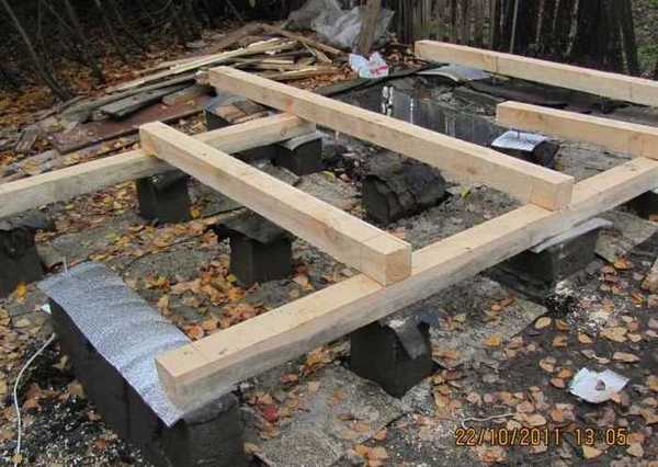 Под шпильки, торчащие из фундамента, мы просверлили отверстия, положили перекрытие, затем закрепили его шайбой с гайкой при помощи накидного ключа. Под дерево для гидроизоляции уложили кусок рубероида. У нас получилась нижняя обвязка фундамента, весь брус лежит на столбах, прочно затянут шпилькой с гайкой. Обработаем дерево защитным составом (мы использовали отработанное машинное масло).