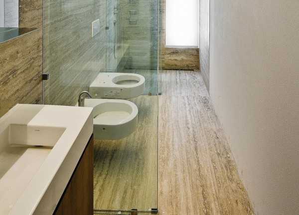 Совмещение ванной с туалетной комнатой, и создание единой территории совмещенного санузла, требует зонирования пространства. Отделяющим мокрую зону от остального пространства элементом, может стать стеклянная перегородка. Стекло отлично ограждает сухую зону от проникновения воды. Еще стеклянные перегородки устанавливаются в случае, если хозяин квартиры отказывается от ванной и предпочитает оснастить санузел просторным душем: