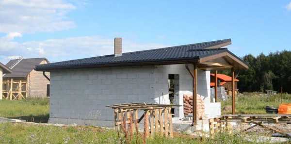 Начинают кладку с углов, которые укладывают четко по уровню. Далее возводят стены. Крыша может быть односкатной или двухскатной.