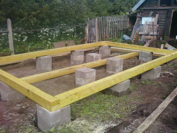 Верх столбов закрывают рубероидом и укладывают балки основы по периметру будущей постройки. Закрепляют балки скобами или гвоздями к опорным стойкам. Внутри периметра монтируют дополнительные брусья с шагом 20 см и параллельно друг другу. Это будет основа для напольного покрытия. Можно заменить брус арматурной решеткой, установить опалубку и залить бетоном.
