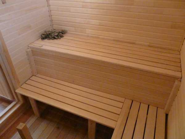 Нижнюю полку крепят к стенам на уровне 50-65 см от пола, верхнюю – на расстоянии 1 м от потолка сауны. Обычно делают 3 полки шириной от 30 см, в зависимости от сложения домочадцев. Для изготовления полок используют такие же доски, что и для внутренней обшивки. Предварительно они хорошенько шлифуются, пропитываются антисептиком, затем специальным лаком.
