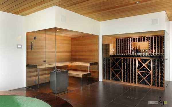 Эта парная возле полукруглого бассейна прекрасно соседствует с современным винным погребом. Автономные системы нагрева и охлаждения позволяют размещать в рамках одного помещения такие разные по характеристикам и функционалу утилитарные конструкции.