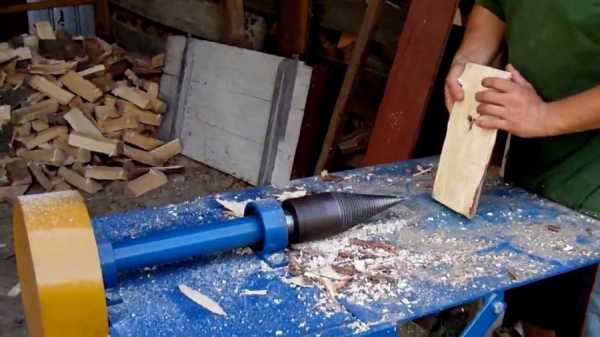 Конус ввинчивается в заготовку, и, благодаря клинообразной форме раскалывает ее. Простота конструкции позволяет изготавливать подобные устройства самостоятельно.