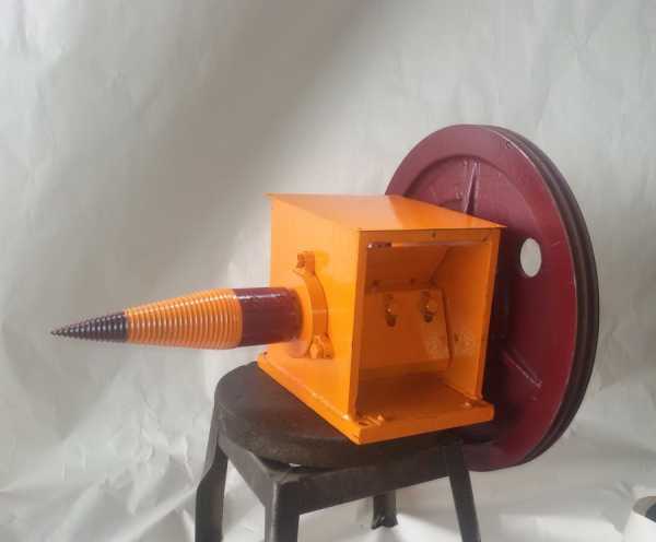 - Конусный тип. Распилка дров производится конусом с резьбой, который в процессе вращения врезается в бревно, разделяя его на части. Так же как и реечный дровокол, его достаточно просто сделать самостоятельно. Единственным нюансом является необходимость в более мощном двигателе.