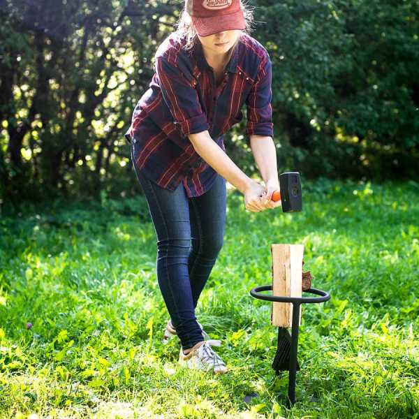 В кольцо вставляется чурка и устанавливается на лезвие. Для того чтобы её расколоть, нужно просто ударить по ней сверху кувалдой. Конечно, никакой экономии физических усилий, в данном случае не получается, но, поскольку махать приходится не остро отточенным лезвием топора или конусом колуна, а обычной кувалдой, труд становится намного безопаснее.