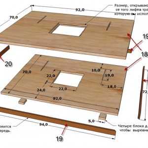 Как видно на схеме, в верхней пластине по центру вырезается широкий прямоугольный участок, после чего остаток приклеивается, или прикручивается к базовой столешнице. В этом прямоугольном секторе делается отверстие по диаметру рабочей фрезы. Далее, рабочая пластина прикручивается к инструменту. Теперь можно вставлять и крепить пластину в нишу. На видео в этой статье показано несколько вариантов сборки таких конструкций.
