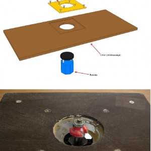 Поэтому, как правило, сама столешница состоит из двух слоев. Нижний слой имеет отверстие по размеру фрезера. А верхняя пластина делается из двух частей, монтажной для фрезера и базовой, которая стационарно крепится к столешнице.